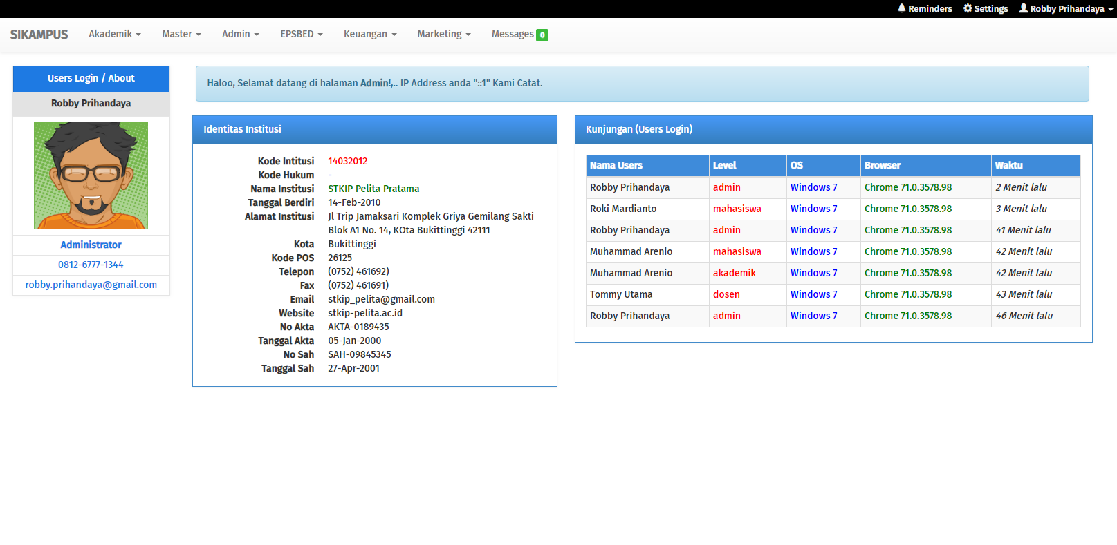 Sistem Informasi Akademik Kampus ini sebelumnya dioperasikan oleh empat Level User (Hak Akses), yaitu Administrator (Superuser), Akademik, Dosen, Mahasiswa. Namun setelah dikembangkan lagi oleh pak Robby Prihandaya dan saya Bhukori Al Muslim maka ada penambahan 2 level baru lagi yaitu Keuangan dan Marketing dan juga ada segudang fitur baru lainnya yang akan dibutuhkan Institusi saat ini.