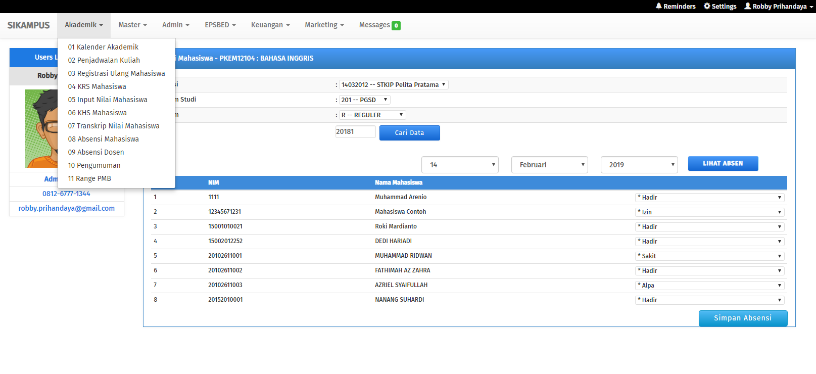 Sistem informasi akademik adalah suatu sistem yang dibangun untuk mengelola data-data akademik, sehingga memberikan kemudahan kepada pengguna dalam kegiatan administrasi akademik kampus secara online. Sistem Informasi Akademik ini dikembangkan oleh Bpk. Roki Aditama yang sudah berpengalaman dalam mengembangkan sistem informasi akademik dan pernah menulis buku Best Seller di Lokomedia dengan judul Sistem Informasi Akademik Kampus Berbasis Web dengan PHP.